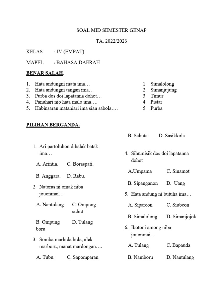 Penjelasan: Soal ini menguji kemampuan siswa dalam memahami isi teks sederhana dalam bahasa Batak Toba dan menjawab pertanyaan berdasarkan teks tersebut.